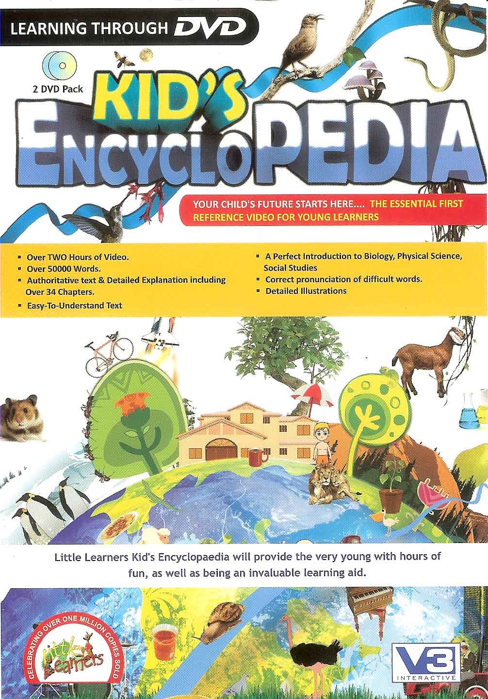"Kid's Encyclopedia (2 DVD Pack) DVD Video YOUR CHILD'S FUTURE STARTS HERE........The Essential First Reference Video for Young Learners Over Two Hours of Video Over 50000 Words Authoritative text & Detailed Explanation including over 34 chapter Easy-To-Understand Text A Perfect Introduction to Biology, Physical Science, Social Studies Correct pronunciation of difficult words. Detailed IIIustrations Little Learners Kid's Encyclopedia is an excellent reference tools for Children, Parents and Teachers. Designed to educate, entertain, and give our child a gentle and simulating introduction to learning. Little Learners Kid's Encyclopedia on DVD Video is entertaining with child friendly format and fun-to-use as well as being highly informative. This DVD Video jump starts children off on a learning adventure that entertains as well as informs and is presented as a superb blend of words, pictures, animations and audio, already an established hallmark of Little Learners Series. You're almost certain to find what you're looking for amongst the truly comprehensive range of subject matter. Little Learners Kid's Encyclopedia is divided in 6 Chapters and 34 Sub Chapters as follows DVD-1: You're Body Growing Up Special Days Where People Live Jobs People Do What People Eat Clothes People Wear Travelling By Air Travelling on Land Travelling By Water What are Things Made of ICE, water & Steam Light & Colour Sound & Music Keeping in Touch DVD-2: Plants & Fungi Flowers Trees Insects Invertebrates Fish Amphibians Reptiles Birds Mammals Cold Lands Mountains Grasslands Deserts Forests Oceans, Lakes & Rivers The Weathers Rocks & Soil The Solar System"
